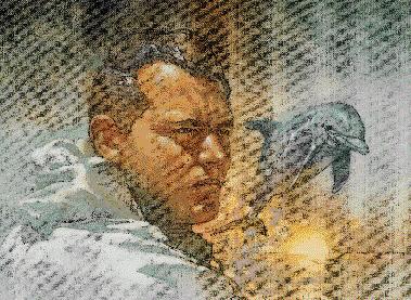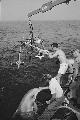 As we approached, Tuffy poked his head above a swell and stood upright in the water, dancing on his flukes higher and higher to gain a better view of us. The dolphin squealed and shook a smiling head as Wally leaped from our small boat onto the corner of the heaving structure and secured the boat with a line. I marveled at how motionless Tuffy remained in the swells. As Wally put the harness on the dolphin, Tuffy rose and fell on the surface exactly in unison with the oil-drum float where Wally sat. Compared to the dolphin's grace in the sea, any man seems out of place there, but Wally seemed especially incongruous in rubber coveralls with suspenders over his shoulders and a straw hat on his head. The trainer would have seemed in place tromping around a Missouri barnyard, but not here straddling timbers in the Pacific. Yet he negotiated the heaving framework of the pen and harnessed Tuffy with ease as the waves rose and fell around us. I could not have done half so well.